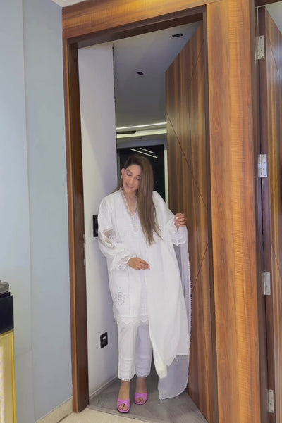Jasmine kurta set blends effortless comfort with refined detailing. The kurta features delicate all-over Schiffli embroidery, accented with colourful patch motifs and finished with intricately embroidered lace details that add a soft, feminine charm. Designed for ease and movement, the silhouette feels light, breathable, and relaxed on the body.